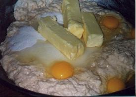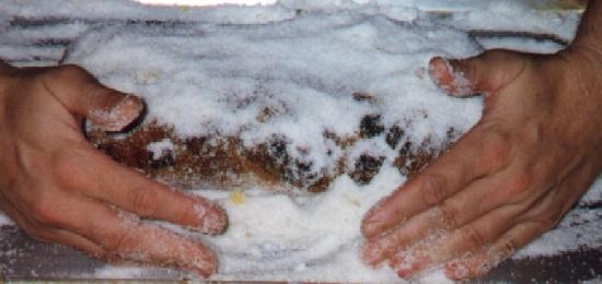Roll into shape like a long egg. Each loaf should be approximately 2 pounds each. Let set a few minutes. Roll out each of the 4 sides leaving a square with a lump in the middle. Roll pin just in the middle of the lump to make a ditch. Brush heavily in ditch with melted butter. Put in cinnamon and sugar mix. Fold 4 flat sides up and seal over top to seal in butter mix. Let rest, but not too long. Stollen should be very heavy, not light like rolls.