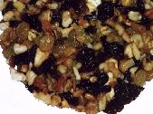 Chop nuts in small pieces. Combine fruit and nuts in a container with a tight fitting lid that can be turned upside down while the fruit is setting to prevent any moisture loss and to better mix the flavors. Combine brandy and rum, anise, orange and almond flavorings and add water to make 1 pint. Add liquid mixture to fruit and nuts mixing well. Seal container and turn upside down if practical. Let set for 3 days before continuing with recipe. It is important to let the mixture set properly or the raisins will burn when cooking.