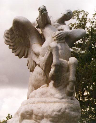A winged horse springs from a mass of clouds, forelegs bent and head lifted in the upward rush. He soars on massive wings, bearing a rider lightly stretched along his back. The sculptor envisioned this group to symbolize the person born with vision and imagination, who is "floating along with Pegasus, symbol of inspiration, through the clouds and over the heights." The granite blocks from which the group is composed were set up in the gardens after they had been roughed out, and the carving was finished in place.Laura Gardin Fraser